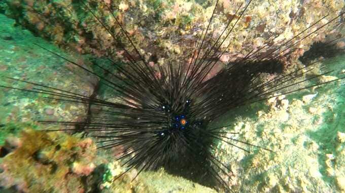 代わりに目立つのが、海藻を食べ尽くすウニです。南方系でトゲが長く商品価値が低いウニの一種「ガンガゼ」がいたるところで見られました。
