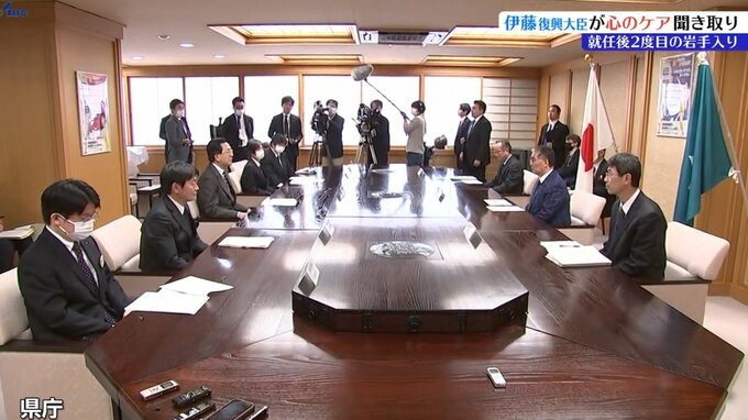 伊藤忠彦復興大臣が8日岩手入りし、岩手県庁で東日本大震災の被災者の心のケアの現状について聞き取りを行いました。