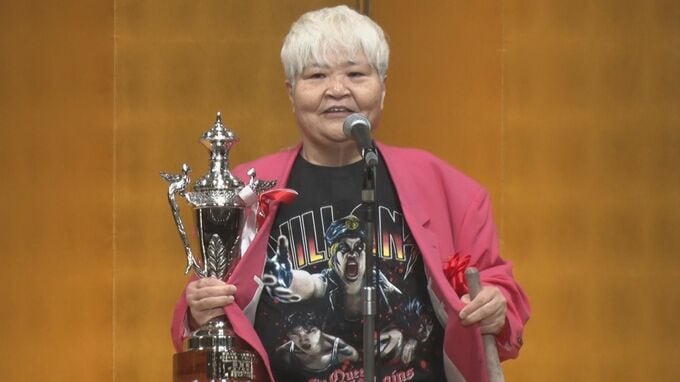 ダンプ松本さんは、自身がモデルとしたNetflixドラマ『極悪女王』の反響を受けての受賞ということで、“ゆりやん始め、女優さんたちのおかげで今ここに立っております。”と感謝を述べると、ジャケットを広げ“今日はみんなのTシャツを着て来ています。”と、メインキャストが描かれたTシャツをアピール。“若いお客さんが少しでもプロレスを見にきてくれて、プロレス界が盛り上がってくれれば「極悪女王」をやった甲斐があります。”と、想いを口にしました。
