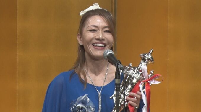 ブル中野さんは、日本人女子として初のWWE名誉殿堂入りを果たしたことからの受賞。喜びの笑顔を見せたブルさんでしたが、スピーチでは“現役時代がんばっていたんですけど、その時は東スポさんは(賞を)くれなかったですね。WWEも30年待った。東スポの方は40年以上待ってました。”と、チクリ。恨み節で会場を笑わせた後は“ダンプさんと岩谷麻優ちゃんと話題賞をいただけて、本当に嬉しい”と、満面の笑みを見せていました。
