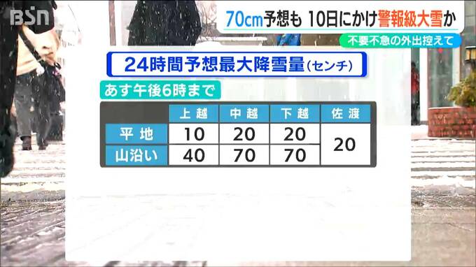 山沿いでは「24時間で70cm」平地でも大雪に 新潟県内各地の雪模様 新潟放送 2025年1月8日(水) 20:05 国内 今後、雪はどれくらい降る? 9日夕方までの24時間予想降雪量は、いずれも多いところで、中越と下越の山沿いで70cm、中越と下越の平地で20cmなど。 10日夕方までの24時間降雪量は、上越・中越の山沿いで70cm、上越と中越の平地で40cmと予想されています。
