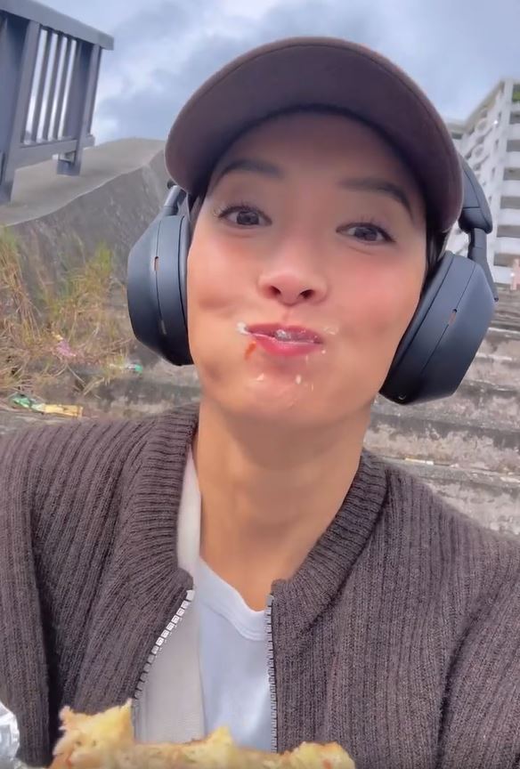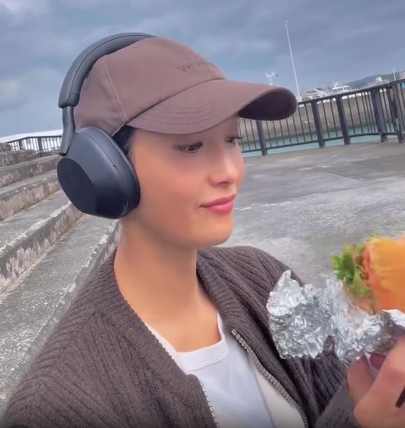 撮影の合間なのか、キャップをかぶり、耳にはヘッドホンをつけて、リラックスした表情の菜々緒さん。