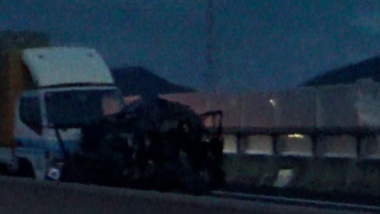午前1時すぎ、高松市太田下町の高松自動車道上りで走行車線にとまっていた軽乗用車に後ろから走ってきた大型トラックがぶつかり、さらに後続のトラック3台がぶつかりました。