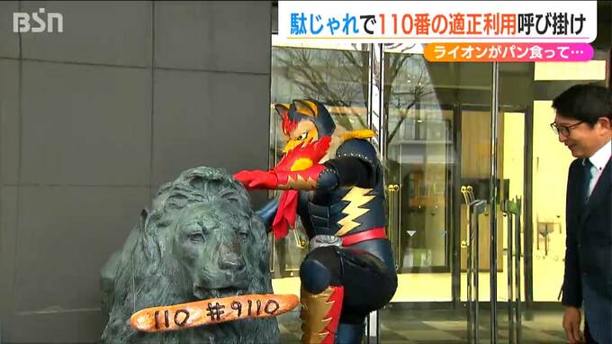 1月10日の110番の日を前に警察があのヒーローと一緒に110番通報の適正利用を呼びかけました。ポイントはライオン像がくわえた『パン』です。駄じゃれなんですが、分かりますか?新潟三越からNEXT21に移動したあの…