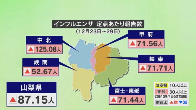 地域別では中北が最も多い125人。他のエリアも50人~70人台に増加し、県によりますと山梨県内はこれまでにない規模でインフルエンザの流行が拡大しているということです。