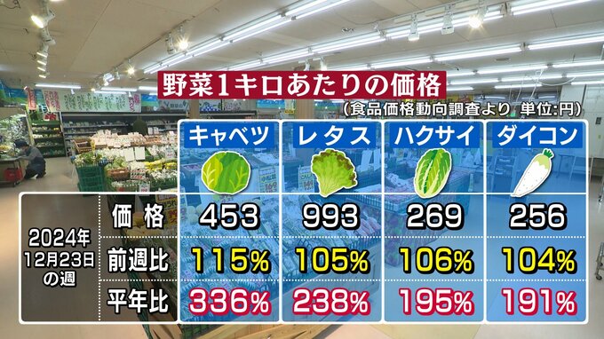 レタスの平均価格は993円と平年のおよそ2.3倍、