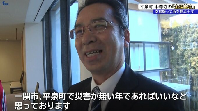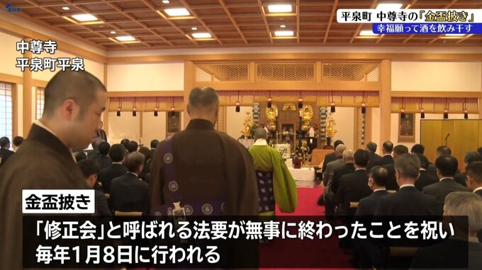 平泉町の中尊寺で8日、1年の幸福を願いながら金色の盃で酒を飲む「金盃披き」が行われ、参加者が五穀豊穣などを願って注がれた酒を飲み干していました。