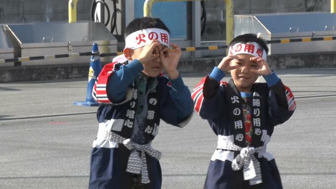 名護市消防本部の出初式には各地の消防団員など多くの関係者が参加しました。渡具知市長による特別点検が行われたあと、保育園の園児たちが元気よくダンスを披露しました。