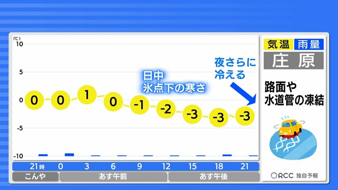 あす日中の気温の上がり方は鈍く、朝からほとんど気温が上がらない予想です。北部では日中氷点下の寒さが続きそうです。路面や水道管の凍結に十分ご注意ください。