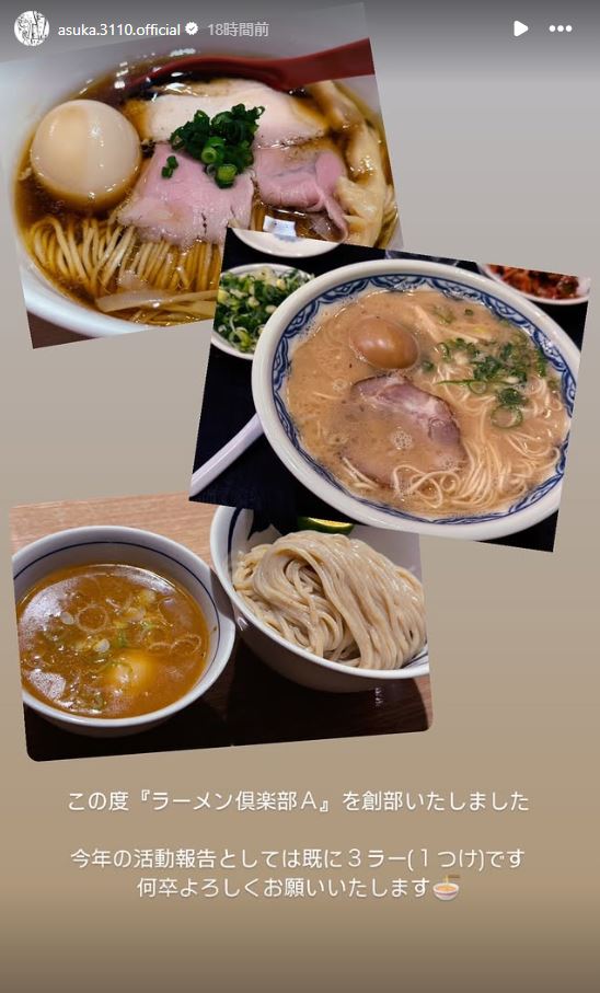 齋藤さんは「この度『ラーメン倶楽部A』を創部いたしました」と公表。「今年の活動報告としては既に3ラー(1つけ)です」としています。
