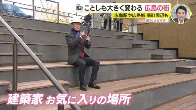 小林キャスター「大階段をつくった建築家の吉田さんにお気に入りの場所は、上から3段目。この場所から座って見ると、駅前大橋を渡って広島駅に来る広島電鉄の路線を真上からよく見ることができます」