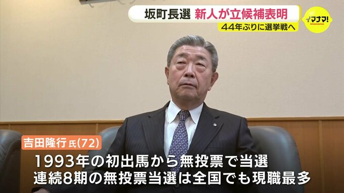 坂町長選挙には、すでに現職の吉田隆行氏が9期目をめざして出馬を表明しています。吉田氏は1993年の初出馬からすべて無投票で当選をしていて、全国町村会によりますと、連続8期の無投票当選は全国でも現職最多です。