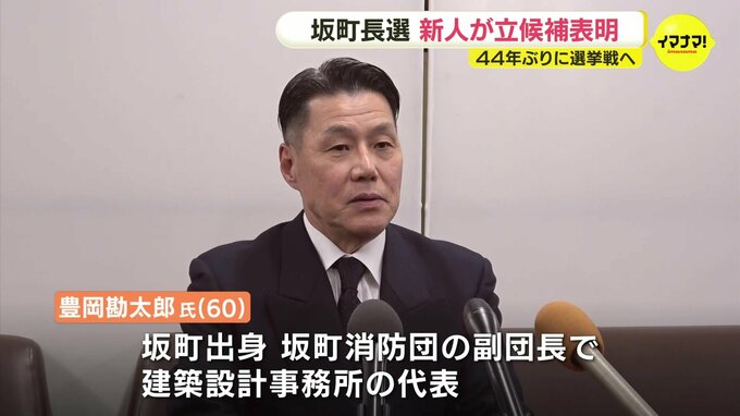 今月告示される坂町長選挙に、無所属新人の男性が立候補を表明しました。現職も出馬予定で、坂町では44年ぶりの選挙戦が行われることになります。