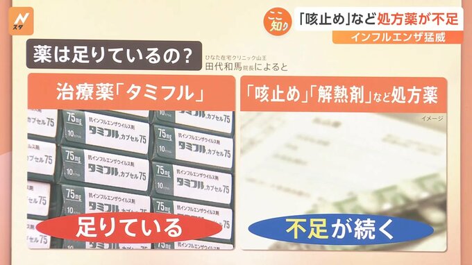 ひなた在宅クリニック山王の田代和馬院長によると、▼治療薬「タミフル」は足りているそうです。▼「咳止め」「解熱剤」など処方薬は不足が続くということです。