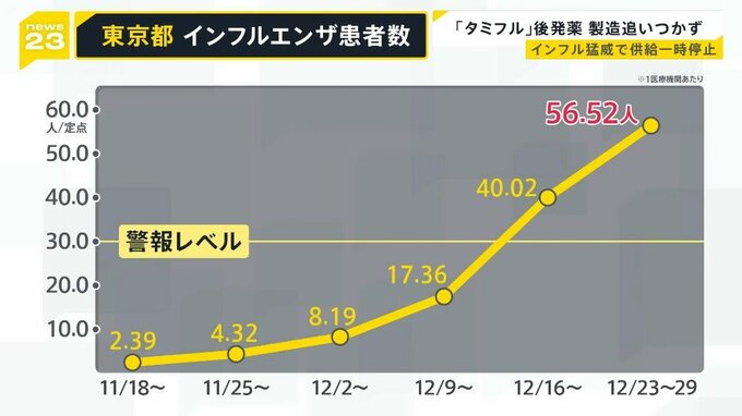 東京都は、インフルエンザの患者数が前の週に比べ1.4倍に急増したと発表しました。感染拡大によって「タミフル」後発薬は製造追いつかず、供給が一時停止となっています。
