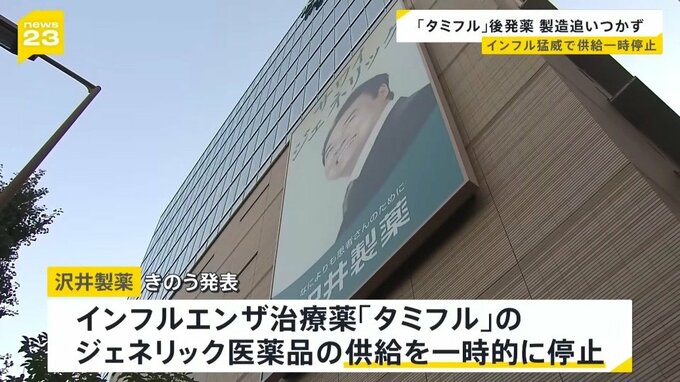 沢井製薬は8日、インフルエンザの治療薬「タミフル」のジェネリック医薬品の供給を一時的に停止すると、医療関係者向けに発表しました。