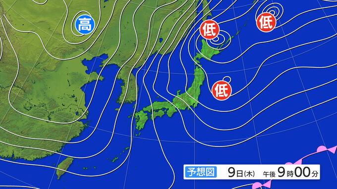 【大雪情報】「JPCZ」による雪雲は9日夜に北陸へ 厳しい冬型は続き東北日本海側は上空約5500メートルで-39度の寒気 北陸を含め大雪のおそれ 最新の雪と風シミュレーション 北陸放送 2025年1月9日(木) 09:54 国内 9日(木)は冬型の気圧配置が強まり、日本海側を中心に雪が降る見込みです。東北の日本海側や北陸では雪の降り方が激しくなりそうです。特に北陸では、9日夜に発達した雪雲が流れ込み大雪になるおそれがあります。大雪による交通障害などに注意・警戒をしてください。 9日午後9時の予想天気図です。冬型の気圧配置が続く見込みです。 9日(木)午後9時の予想天気図 等圧線の間隔も小さい状態が続いていて、9日は風も強まるでしょう。