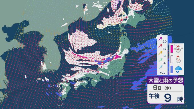 【大雪情報】「JPCZ」による雪雲は9日夜に北陸へ 厳しい冬型は続き東北日本海側は上空約5500メートルで-39度の寒気 北陸を含め大雪のおそれ 最新の雪と風シミュレーション 北陸放送 2025年1月9日(木) 09:54 国内 この先の雪と風の予想です。大雪については、日本海で発生するJPCZ(日本海寒帯気団収束帯)の動向がポイントになります。 JPCZは、大陸からの風が朝鮮半島北部の山でぶつかってふた手に分かれ、その風の流れが日本海で一緒になり、冬の寒い時期は雪雲を発生させます。 9日夜はJPCZで発達した雪雲が北陸地方に流れ込む見込みで、石川県に収束した風が向かうおそれがあります。 9日の夜にかけては能登半島でも雪の降り方が強まりそうです。
