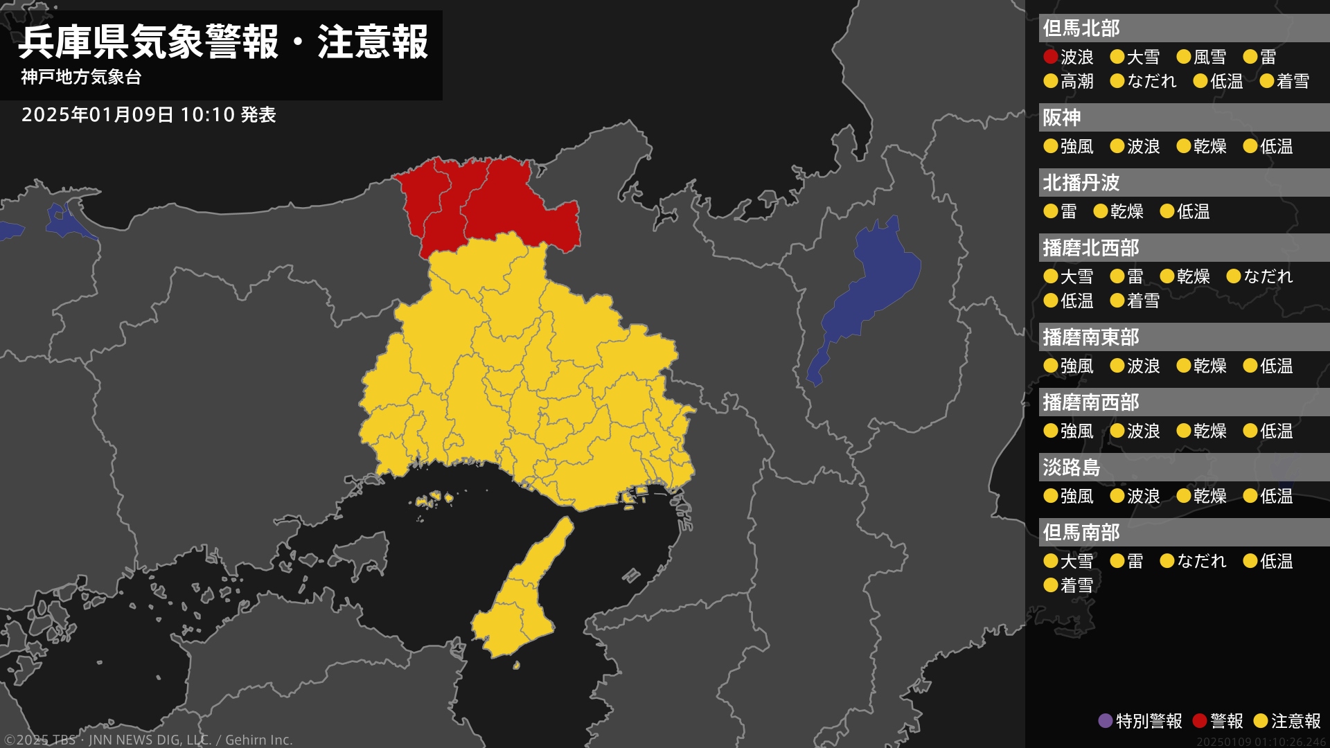 気象台は、午前10時10分に、波浪警報を豊岡市、香美町、新温泉町に発表しました。