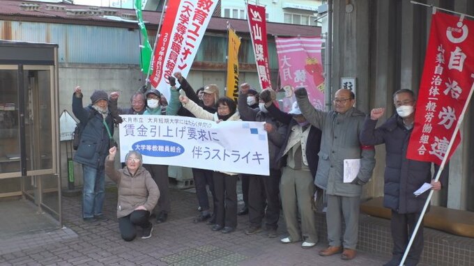 ストライキは大月市や短大が昨年度「非常勤職員の時給を500円引き上げる枠を作った」と説明したにもかかわらず、実際は100円の引き上げにとどまっていることを受け、大学等教職員組合が実施したものです。