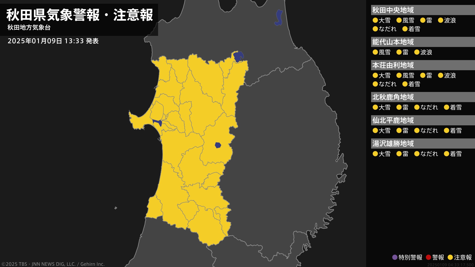 気象台は、午後1時33分に、なだれ注意報を秋田市、男鹿市、潟上市、五城目町、八郎潟町、井川町に発表しました。