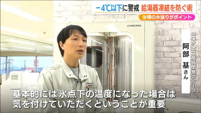 【コロナ エコ商品開発グループ 阿部基 主任技士】「こちらの方の凍結というのが進行してきてしまいますと、徐々に凍結する範囲というのが広がっていって、給湯器側まで凍結してしまうと、給湯器側の破損だったり、故障という形にもつながります」