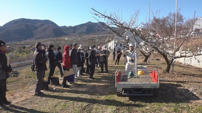 山梨市の果樹試験場では、県立農林大学校の講師が高い所の作業で使われる高所作業車や農薬散布に用いられるSSなどを運転しながら扱う際の注意点を説明しました。
