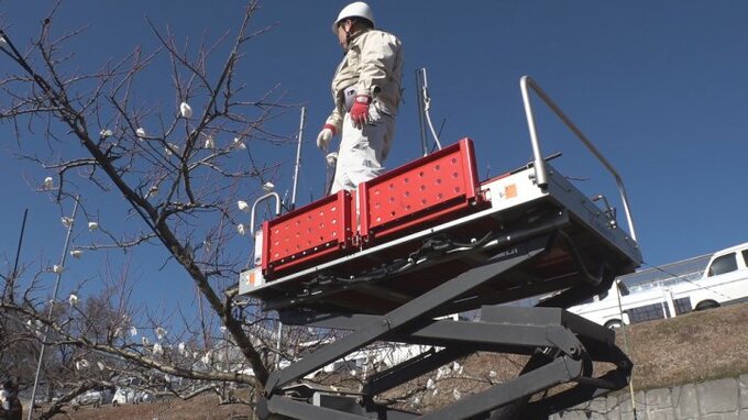 このうち高所作業車は上昇するときに枝に挟まれないよう注意することや、なるべく平らな場所に機械を止めて作業することなどを呼びかけていました。