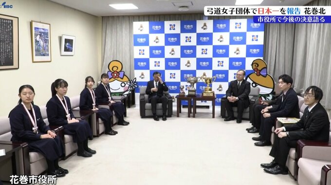 弓道女子団体で日本一となった岩手県立花巻北高校の生徒が、花巻市役所を訪れ市長に優勝を報告しました。