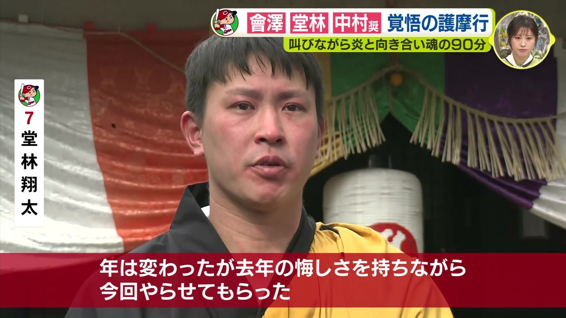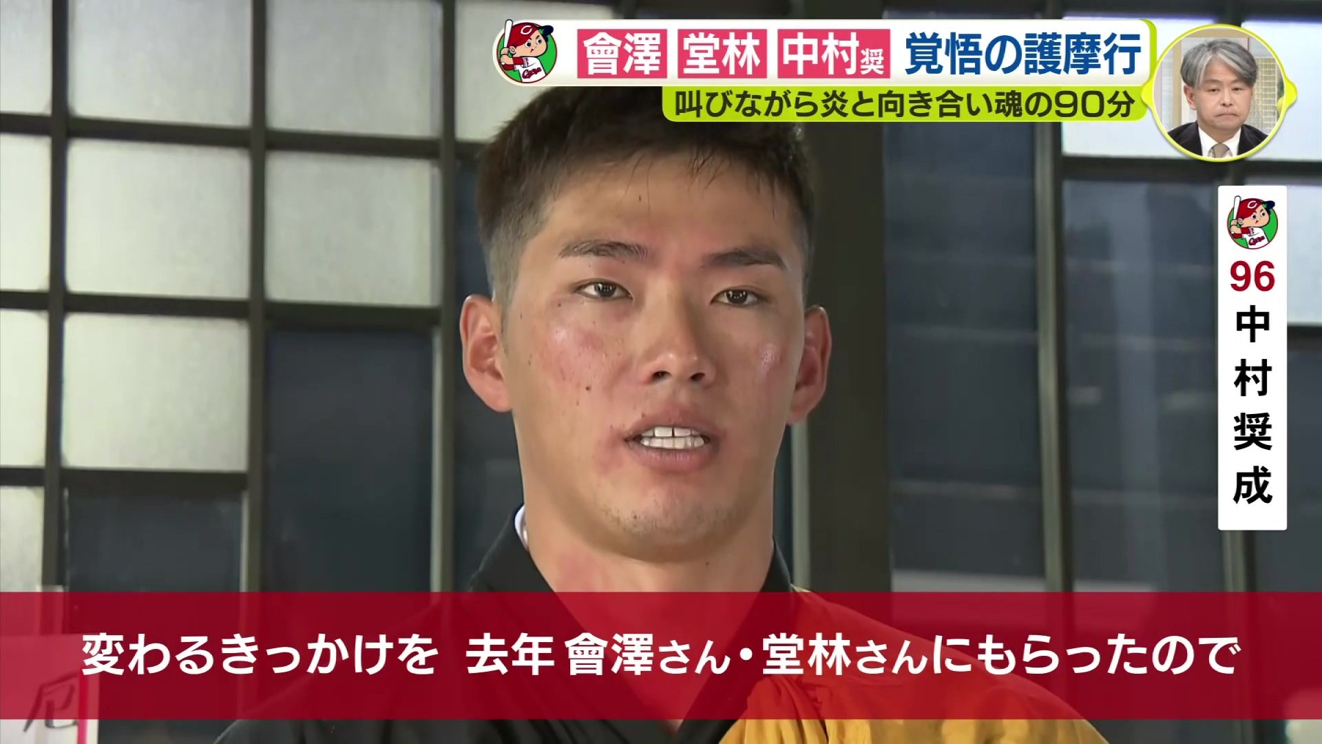 中村奨成 選手は、去年、この護摩行を体験したことによってシーズン中でも2軍に行ったときに自分の中でしっかり冷静にそれを受け止められるようになったと言っていまして、この護摩行で精神を研ぎ澄ませて、またシーズンに臨んでいくんだなという感じがします。