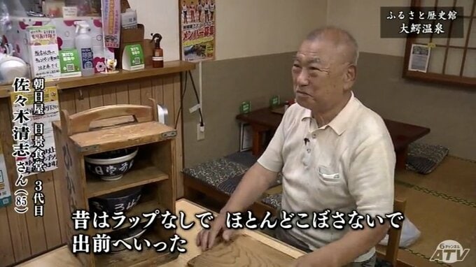 明治時代に創業した朝日屋日景食堂(あさひや・ひかげしょくどう)にも活気溢れる温泉街を伺えるものは残っています。3代目の佐々木清志(ささき・せいし)さん85歳は、旅館や客舎からの注文で出前に駆け回ったといいます。