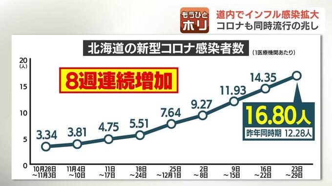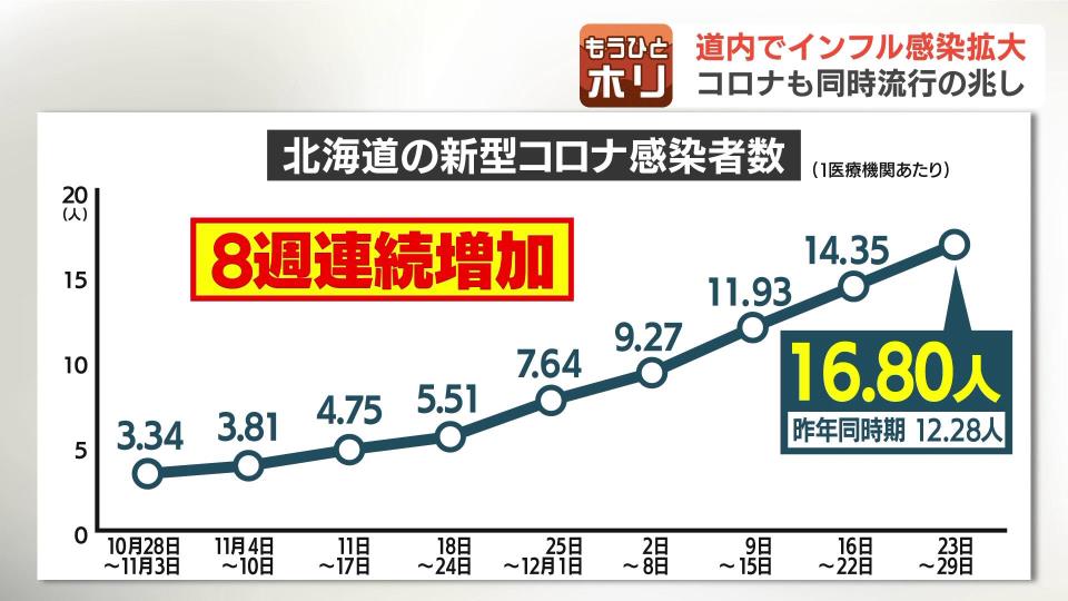新型コロナの流行状況も、9日に発表されました。1つの医療機関あたりの患者数は、全道平均16.8人で、去年11月から8週連続で増え続けています。去年の同時期の12.28人と比べ、4割近くも増加しています。