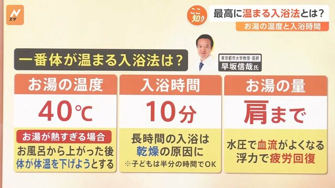 最高に温まりポカポカになる入浴法を見ていきます。4万人以上の入浴を医学的に研究されている入浴研究の第一人者、東京都市大学教授・医師の早坂信哉さんに教えていただきました。