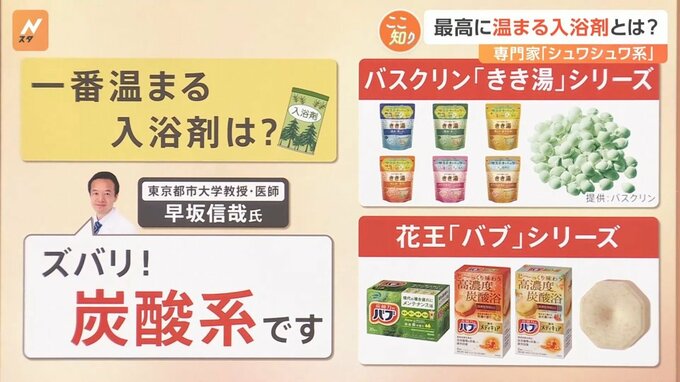 一つ目のおすすめは、バスクリン「きき湯」シリーズ、二つ目は花王「バブ」シリーズです。炭酸系は二酸化炭素が体の中に入ってきて血流がよくなるということなのだそうです。血行が良くなって血流も良くなるので、非常に温まりやすいということです。
