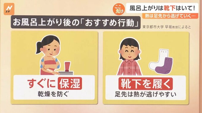 また、お風呂上がりのおすすめの行動として、すぐに保湿して乾燥を防ぐこと、足先は熱が逃げやすいため靴下を履くことだということです。