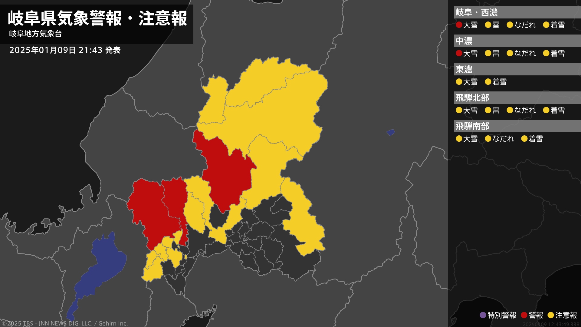 気象台は、午後9時43分に、大雪警報を本巣市、郡上市、揖斐川町に発表しました。またなだれ注意報を関市、本巣市、下呂市に発表しました。