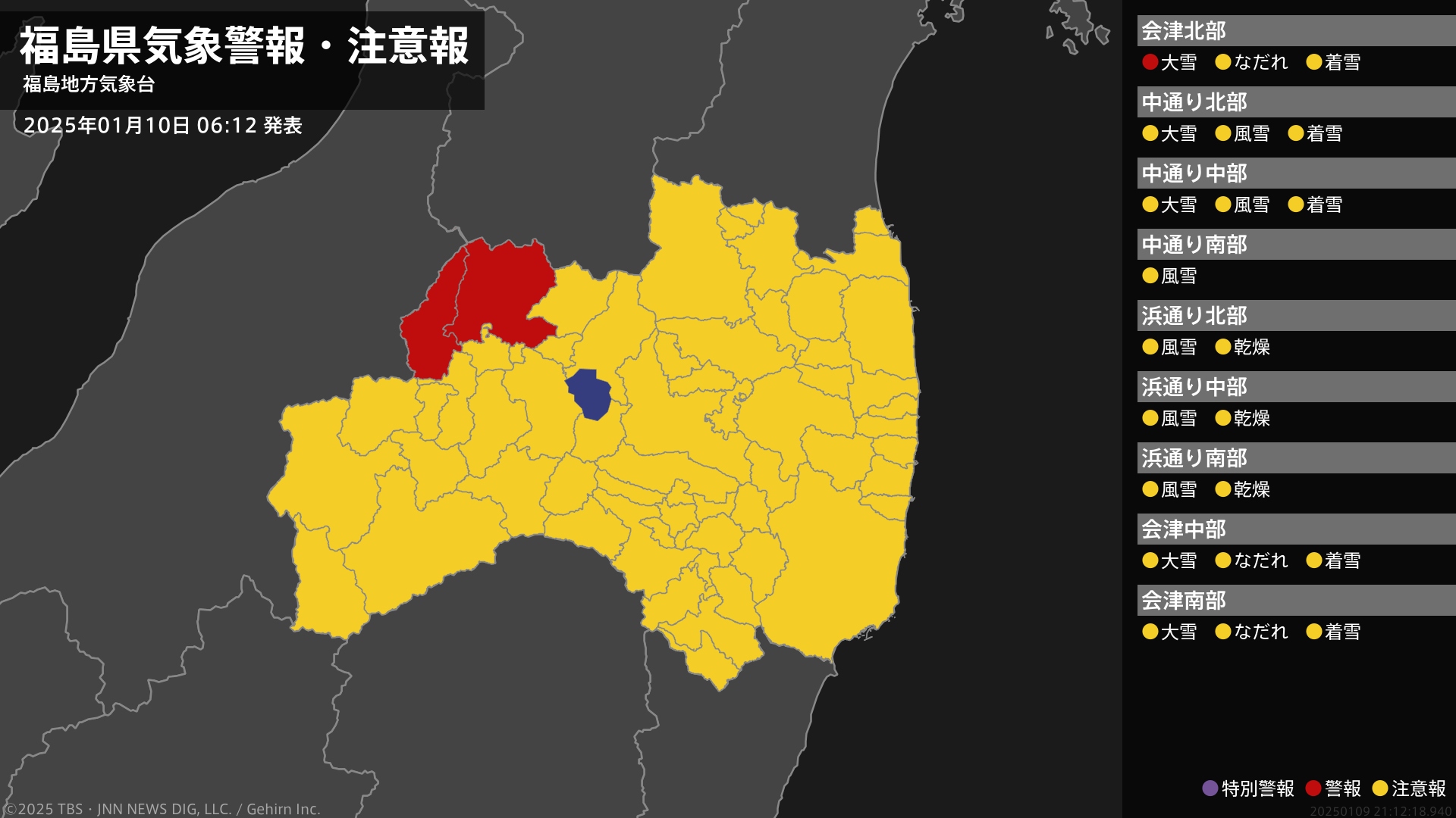 気象台は、午前6時12分に、なだれ注意報を会津坂下町、湯川村に発表しました。