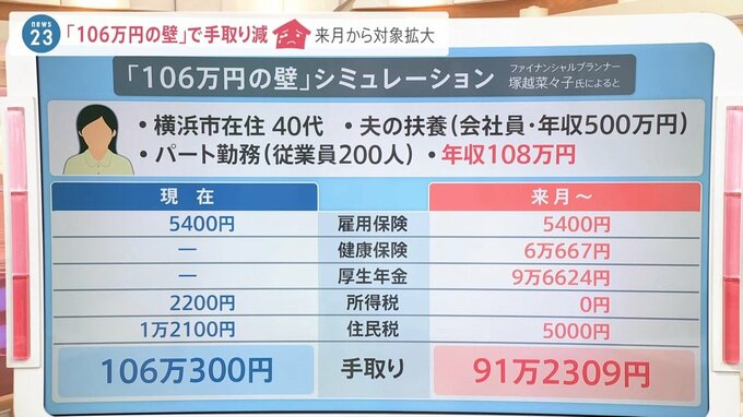 横浜市在住の40代の妻がパート勤務(従業員200人)で年収108万円の場合でみていくと、現在のルールだと手取りが106万円ほどなんですね。ただこれが10月からは、従業員が100人超えという壁の条件に引っかかってしまうために、健康保険や厚生年金の負担が増える。そうすると手取りが91万円です。比較すると15万円近く減ることになってしまう。