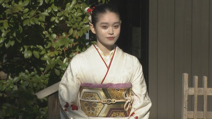 髙石さんは、白を基調とした鮮やかな晴れ着姿で登壇。“新年明けましておめでとうございます。本日は寒い中お集まりいただきありがとうございます”と、笑顔で挨拶しました。