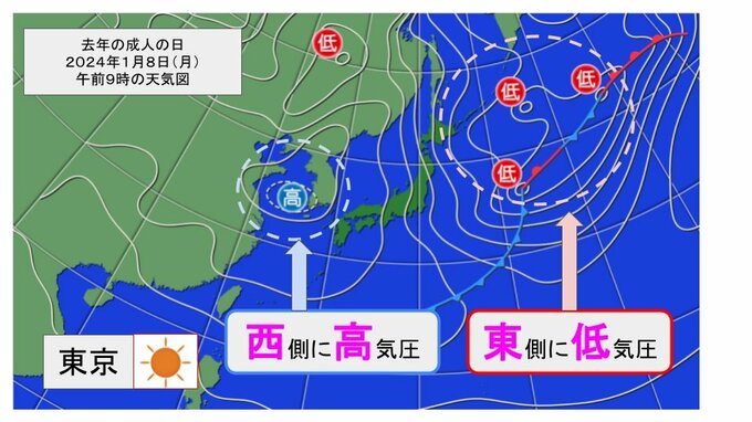 成人の日の辺りは1年で一番寒い時期。一番寒いということは西高東低の冬型の気圧配置になりやすく、カラカラの晴天になります。なので寒くて晴れているというのが特徴です。ただ必ず晴れるというわけではないので、何かが降る時もあります。一番寒い時期なので雨より雪が降ることが多くなります。