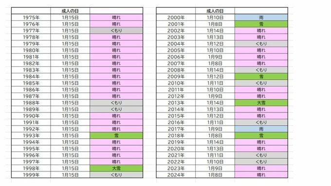 TBSテレビお昼の情報番組「ひるおび」でおなじみの気象予報士・森朗さんと、過去の天気から最新の天気予報まで天気に関するありとあらゆる情報をお届けする「お天気タイムマシン」。今回のテーマは「成人の日の天気」です。みなさんの成人式の日は晴れていましたか?それとも雪でしたか?(アーカイブマネジメント部 萩原喬子)