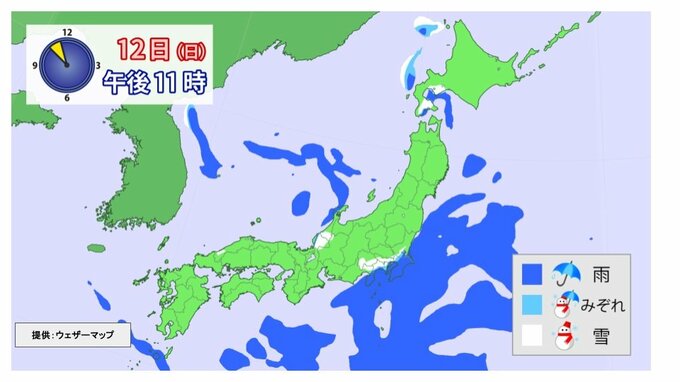 日曜日(2025年1月12日)の夜遅くに雪になるかもしれないんですが、降る時間は短いです。ただし夜降るので意外と積もったり、翌日、月曜日の朝、凍結などに注意が必要です。