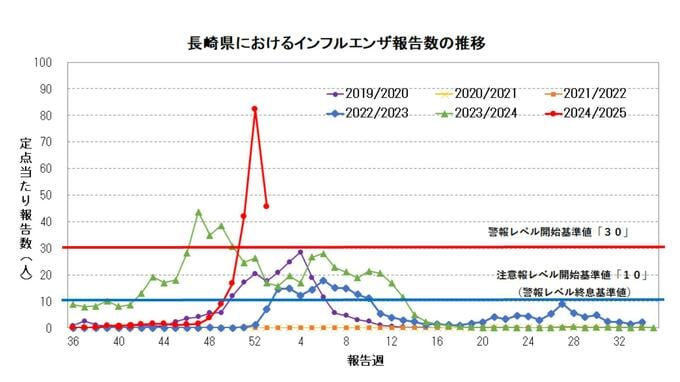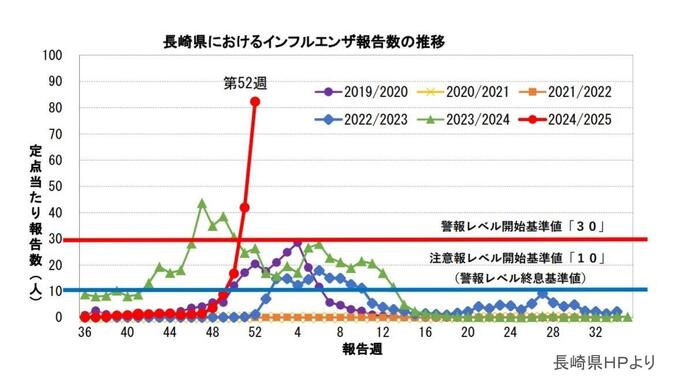 長崎県では12月23日~29日の定点当たりの報告数が1医療機関当たり「82.27」となり前週から倍増。警報レベルの基準値「30」を大きく上回る急激で爆発的な流行となっています。