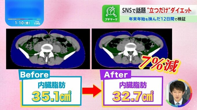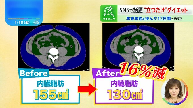 テレビのリモコンを離れたところに置くなど、「立つ時間」を1日平均3時間増やしたところ、【内臓脂肪】が<155㎠>⇒<130㎠>と16%減少!