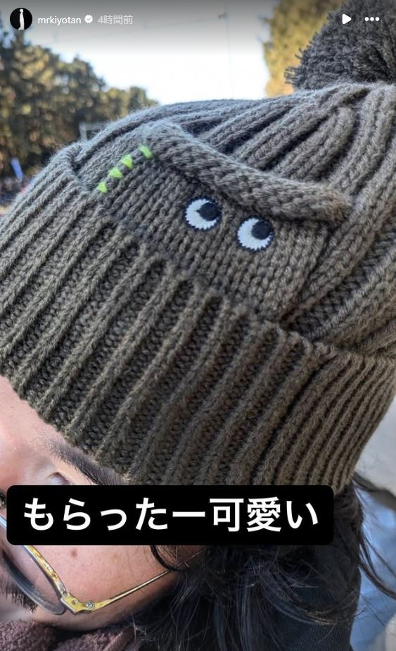 清原さんは、キョロリとした目玉が刺繍されたニット帽をかぶった様子をストーリーズに投稿。「もらったー可愛い」と嬉しそうな思いを大書しています。