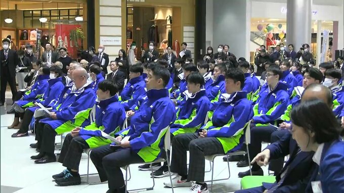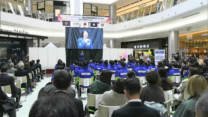 今月26日から来月5日まで岡山市と倉敷市で開催される「晴れて輝け!おかやま国スポ」をPRするとともに、選手たちを激励しようと開かれたもので、選手や関係者およそ100人が参加しました。