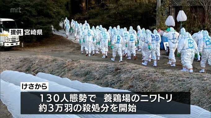 串間市の養鶏場で宮崎県内では今シーズン2例目となる高病原性の可能性が高い鳥インフルエンザが確認されました。これを受け、県はニワトリおよそ3万羽の殺処分を始めました。県によりますと、10日串間市のブロイラ…