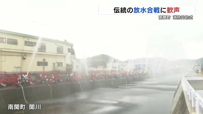 11日、熊本県南関町の消防出初式で伝統の放水合戦が行われました。南関町の中心部を流れる関川(せきかわ)に集まったのは消防団員約320人。合図と同時に一斉に放水を始めると水のカーテンが現れました。この後は…