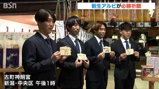 必勝祈願のため新潟市中央区の古町神明宮に訪れたアルビレックス新潟の樹森大介監督と選手たち。昨シーズンはルヴァンカップで準優勝を果たしたものの、リーグ戦では20チーム中16位の成績となりました。