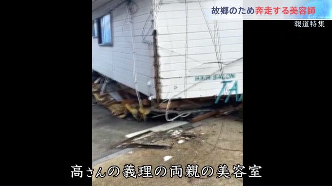 番組が取材した、被災直後の高さん。自宅のある集落は道路が寸断され、一時孤立状態になった。義理の両親が営んでいた美容室は、2階から崩れ落ち、原型を失った。